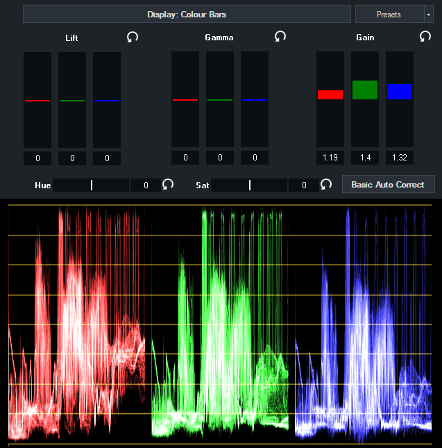 Colour correction is achieved using the industry standard Lift, Gamma and Gain controls as described below: