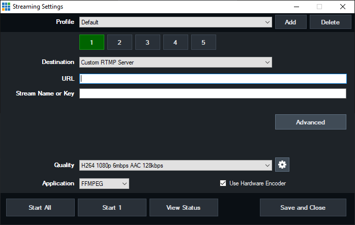 Select the encoding profile to use for the stream. A number of built in presets are included or you can click the cog icon to customise these.