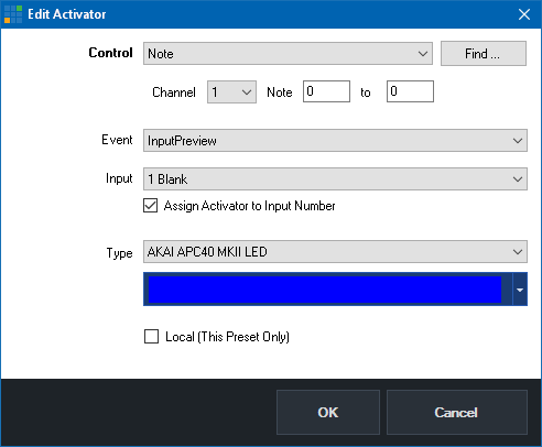 Turn a button on the AKAI APC40 MK2 controller blue when Input 1 is in Preview